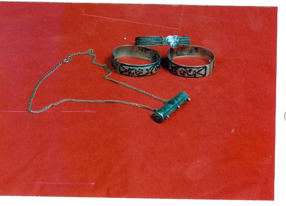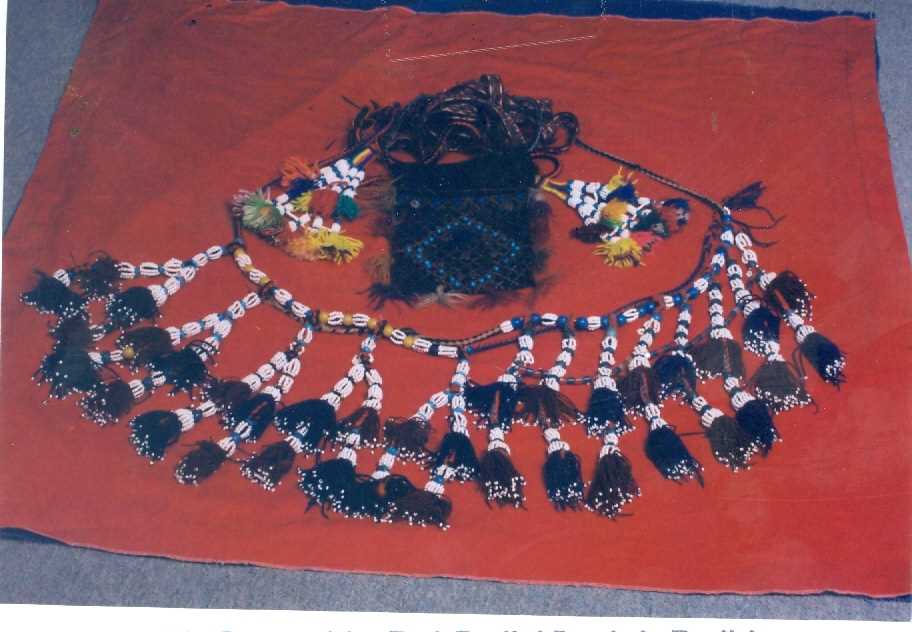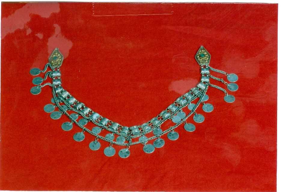 Mavi ve beyaz boncuklar ile yün ipliklerden hazırlanır. Püskülleri boncuklarla zenginleştirilir. Belin arka kısmına bağlanır.